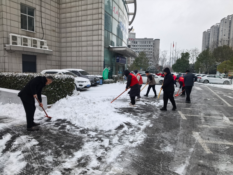 在市政务服务中心集中办公区,大家不畏严寒、分工协作,手持铁锹等工具,奋力铲除冻结坚冰、清扫路面残雪,为办事群众与过往行人开辟出安全通畅的出行通道。